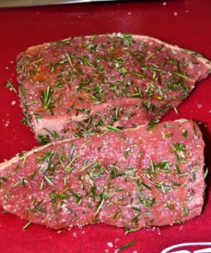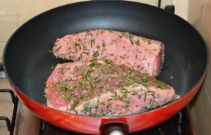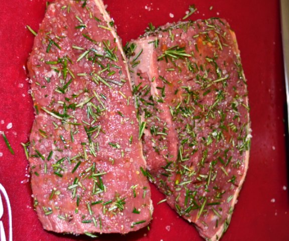 Corte a peça de lagarto ao meio em dois pedaços, como mostra a foto. Passe a mistura de ervas e sal na carne cobrindo ela por inteiro.