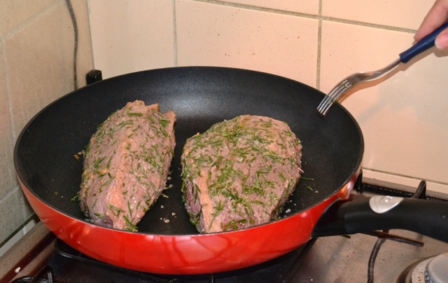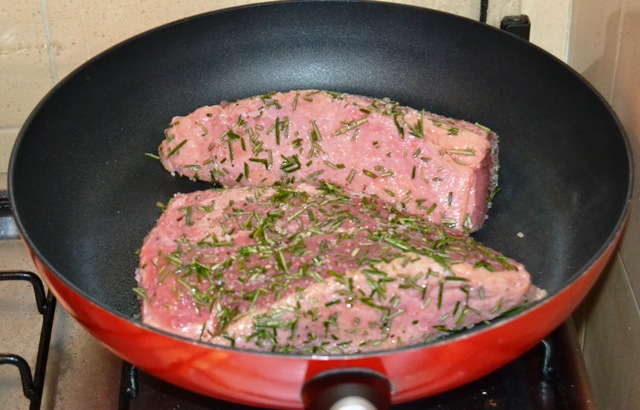 Com um garfo vá fritando a carne e girando até que todos os lados estejam dourados, como mostra a foto abaixo: