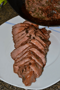 PASSO 4: O ponto do rosbife é dourado nas pontas e avermelhado no centro, se você quiser mais passado deixe um pouco mais que 20 minutos. O meu ficou um pouco mais pois o degustador prefere assim kkkkk. Dá para ver na panela o caldo da carne com as ervas que se desprendem. Coe esse caldo e reserve para servir com a carne ao final.