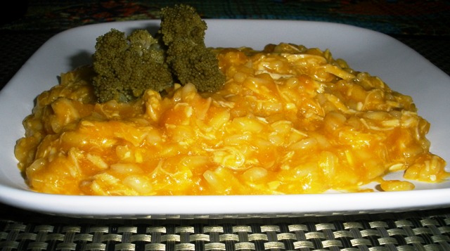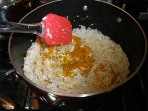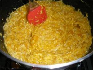 Quando o arroz estiver cozido, coloque o frango e em seguida a abóbora e mexa bem.