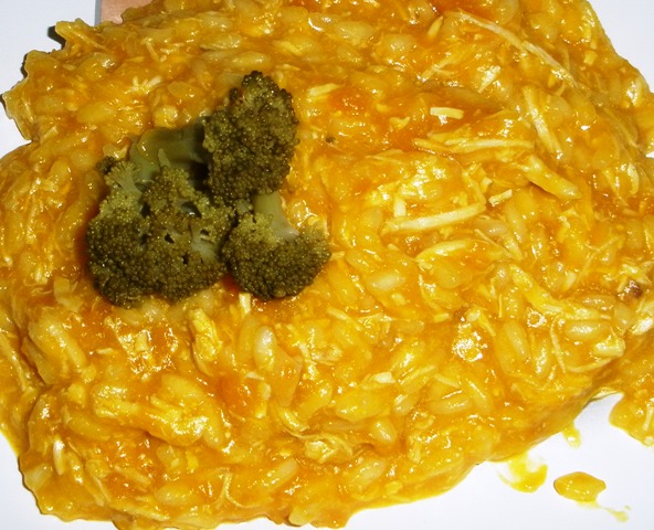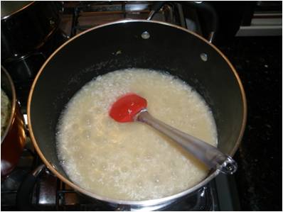 Em seguida, vá colocando o caldo do frango que deverá estar bem quente- o caldo deve estar quente, colocado concha a concha e com o fogo baixo, para que o amido do arroz se desmanche lentamente.  Verifique o ponto do arroz que deverá estar bem molhado e cozido- isso levará mais ou menos 10/15 minutos