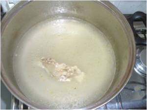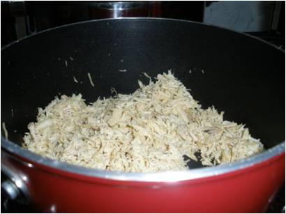 Em uma panela cozinhe o peito de frango com um pouco de sal e reserve esta água que será utilizada no preparo do risoto. Se quiser, pode colocar meio caldo de galinha. Eu não coloquei pq acho que tem muita gordura, muito sal e conservantes. Uma vez um chefe- Beto Barreiros disse que: “O caldo é a alma do risoto e quem usa desses subterfúgios industrializados acaba criando um prato sem alma, uma ovelha Dolly, um clone culinário, um zumbi gastronômico”. – Caprichem no caldo! A quantidade de caldo é grande: cada xícara de arroz absorve até quatro de liquido. Eu sempre acho que é melhor sobrar do que faltar.