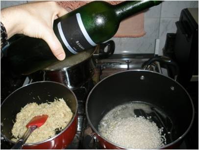 Em outra panela prepare o risoto- Coloque o restante da manteiga e o arroz- deixe cozinhar uns 2 minutos e coloque o vinho- cozinhe mais dois minutos até o álcool evaporar.