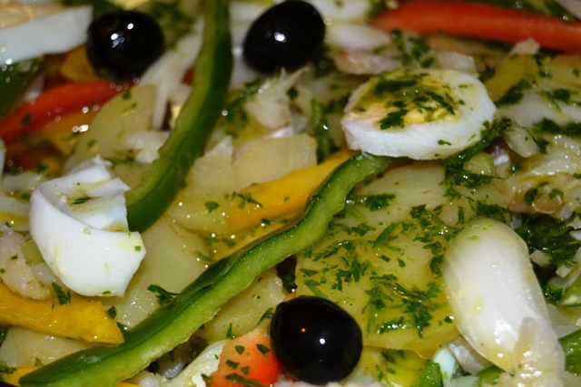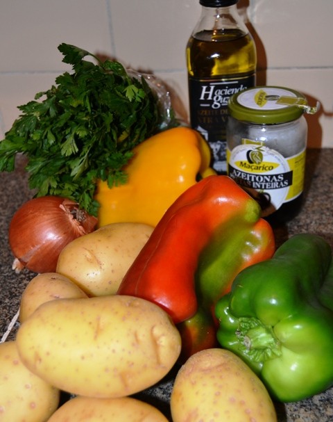 Agora vamos montar o bacalhau, em um pirex ovalado vamos colocar um pouco de azeite primeiro (sem a salsinha), coloque as batatas pré cozidas, uma camada de cebola, um pouco do mix de pimentões, um pouco de bacalhau, os ovos cozidos, as azeitonas pretas e regue com o azeite de salsinha, vá montando as camadas conforme a foto: