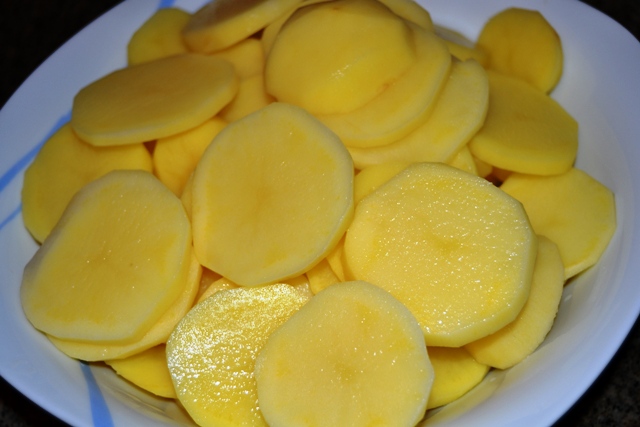 Corte as batatas em rodelas com meio milimetro cada como mostra a foto e cozinhe SEM SAL deixando-as um pouco al dente, NÃO poderão desmanchar e reserve.